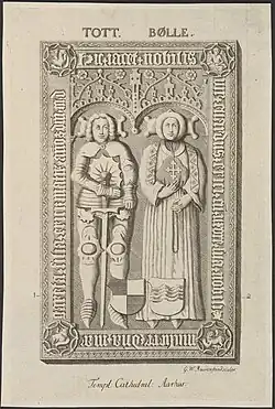 The estate was later owned by members of the Moltke family. Evert Moltke was married to Helene of Bjernede. In a surviving document, written in Latin, from 1583, she transferred the estate to her son Henneke Johan Moltke. On his death, Bavelse passed to his sons Evert and Mathias Moltke.[1] Evert Moltke was married to Beatre Rønnow. Their daughter and only child Evertsdatter Moltke was married to Erik Aagesen Thott. He inherited Bavelse upon his father-in-law's death in 1454. Erik and Beatre Thott had four children. After Erik Andersen Thott's death in 1494, Bavelse passed into the joint ownership of his son Erik Eriksen Thott (died childless[1]) and son-in-law Herman Flemming. In 1509, Herman Flemming ceded the estate to his elder son Erik Hermansen Flemming. He died on 16 October 1634. Bavelse was then passed to his younger brother Jacob Flemming, who was married to Maren Mogensdatter Juul, daughter of Mogens Pallesen Juel Udstrup and Dorthe Mogensdatter Krabbe. Jacob and Maren had only one child, a daughter, Anna Jacobsdatter Flemming (1544–1570), which made Jacob Fleming the last male member of his family. He eventually died in 1544.[2]