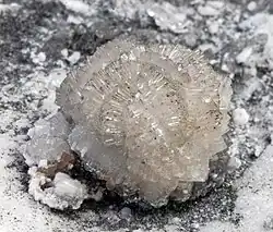 Bavenite is usually associated with beryl, phenakite, bertrandite, quartz, epidote, stibnite, albite, orthoclase, titanite, clinozoisite and tremolite. Although it was discovered in igneous rocks, later it was found in pegmatites as well. Bavenite can also occur in the Alps, where it was created as a product of the hydrothermal weathering of beryllyium-bearing minerals (mostly beryl) through metamorphism. In the latter case, the mineral occurs with zeolite and prehnite.[2] It can also form by low-temperature alteration of beryl and beryllium-bearing minerals, and generally forms in more alkali environments.[5] It can occur on quartz and feldspar in miarolitic pegmatites as a coating. It also occurs as a pseudomorph of beryl. There's a known case of it occurring from pneumatolytically altered syenites, where it grew into singular crystals on albite, up to 1.5 cms of size per crystal. The mineral was not pseudomorphic in this case.[4]