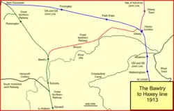 On 30 May 1907 the Great Northern Railway board decided to apply for an order to take over the Tickhill Light Railway's powers themselves, paying £2,300 to the original promoters; the transfer was granted in July 1908. The intended junction at Haxey was simplified; originally it had been proposed to cross directly to the Axholme Joint Railway, but this was not needed by the Great Northern Railway; the simplification would save £10,000. Still not making this a priority, in June 1910 the board ordered construction between Bawtry and Haxey, as soon as land could be obtained, at an estimated cost of £88,000. Haxey was on the Great Northern and Great Eastern Joint Line; as the connection was planned to bring coal to the line for transport south, the Great Eastern Railway agreed to pay for part of Haxey junction. The Great Eastern Railway interest must have been to get access for its trains to the Tickhill colliery area, although they would have needed to construct the Bawtry to Tickhill section themselves.[4]