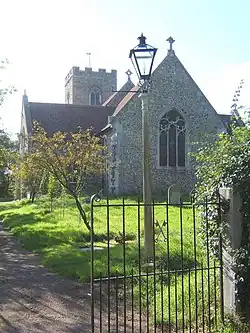 The church is sited at the west end of the village, on a hill just off Church Lane. It was initially constructed in late Romanesque style in the 12th century and had Gothic style windows inserted in the 14th and 15th centuries. Its fittings from this era partially survived both the English Reformation and the later inspection of Dowsing, albeit with damage to animal figures and a symbol of the trilogy. An alabaster of the crucifixion, hidden from the inspection, lay unnoticed in the roofspace of a former clergyman's house opposite the church until its rediscovery and reinstallation in 1774.[20][31]