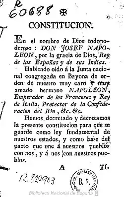 The Bayonne Statute (Spanish: Estatuto de Bayona),[1] also called the Bayonne Constitution (Constitución de Bayona)[2] or the Bayonne Charter (Carta de Bayona),[1][a] was a constitution or a royal charter (carta otorgada)[4] approved in Bayonne, France, 6 July 1808, by Joseph Bonaparte as the intended basis for his rule as king of Spain.