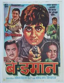 Be-Imaan (lit. 'Dishonest') is a 1972 Hindi-language film directed by Sohanlal Kanwar. The film stars Manoj Kumar, Raakhee, Premnath, Pran, Prem Chopra and Tun Tun.[1]