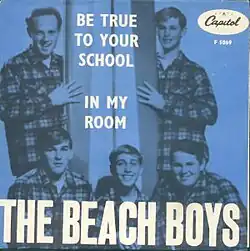 "Be True to Your School" is a song by the American rock band the Beach Boys from their 1963 album Little Deuce Coupe. Written by Brian Wilson and Mike Love, it was issued as a single on October 28, 1963. There are two versions of this song: the album version, and the single version, which added cheerleader yells by the girl group The Honeys in between verses.[1] The song features the melody of the University of Wisconsin's fight song, "On, Wisconsin!", although it is a tribute to Hawthorne High School, which the Wilson brothers and Al Jardine attended. Hawthorne High School's fight song uses the same melody as "On, Wisconsin!".[2]