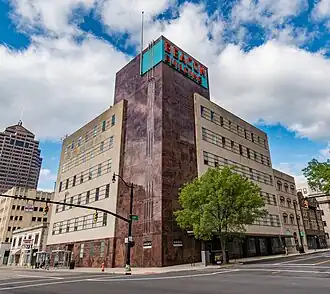 The building features numerous midcentury modern materials: a red granite tower and storefront base, Indiana limestone curtain walls, and three decorative aluminum fins.[5] The fins originally stretched parallel to each other from the first story to the sixth, in 5-foot sections, though most of the sections were removed in 2014.[4] The building's exterior features a large red neon sign on a corrugated teal backdrop, reading "BEACON BUILDING". All six floors have punched windows, connected by aluminum in a grid-like fashion.[6] The building has narrow hallways and ramps with unusual turns and corners, leading some offices to be large and others remarkably small.[3]