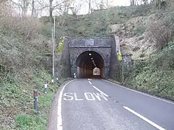 In March 1830 Parliament passed the Bridport Turnpike Trust (Second District) Act, 1830[1] authorising construction of the tunnel, which began the following month. The engineer Michael Lane, a colleague of Marc Brunel who had worked on the pioneering Thames Tunnel in London, was in charge of the project, which took just over two years to complete. Only one fatality was sustained, a worker named William Aplin who died only three days before the tunnel opened when he was struck by a landslide outside one of the tunnel entrances. He was memorialised with a stone marked with a white cross which can still be seen in situ.[3] The tunnel reduced the road's gradient from 1-in-6 (17%) to 1-in-10 (10%) and shortened it by a mile (1.6 km), as well as lowering its maximum elevation by 50 feet (15 m).[4] At the time of its opening, only a handful of road tunnels had been built in Britain;[3] it pre-dates the construction of the first railway tunnels, and it is now the only pre-railway road tunnel in the country still in use.[5]