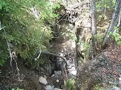 Although a mining and milling plant was constructed on the mine site before Beanland went into operation, there is no record of production.[1][8] The entire plant was still in existence until at least the 1940s. It is now largely demolished; foundations, the 150 horsepower boiler and part of the Ingersoll-Rand Imperial Type 10 air compressor are all that remains of the plant. Much of the waste rock was dumped just northeast of the shaft near a small wetland.[9]