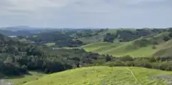 A view looking west down the Bear Creek watershed in Briones Regional Park, showing the coast mixed evergreen forest and grassland typical of the Bear Creek valley. Mount Tamalpais is visible in the distance. (March 24, 2021)