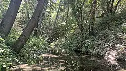 Nearly the entirety of the Bear Creek watershed is undeveloped and within open space or conservation boundaries, making it a rare and sensitive stream in the San Francisco Bay Area. The watershed is covered in coast mixed evergreen forest with dominant trees being Coast Live Oak (Quercus agrifolia), California Bay (Umbellularia Californica) and Valley Oak (Quercus lobata), with some occurrences of Blue oak (Quercus douglasii).[2]