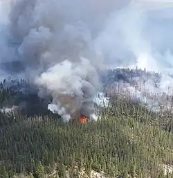 Two days later, on August 29, the fire had spread to approximately 5,000 acres (20 km2), fueled by dead, bug kill and down lodgepole pine and sub-alpine fir.[4] Closures were expanded to the entire area surrounding the fire, specifically the Lowman Ranger District in the Boise National Forest.[5]