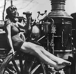 ![]() Beatrice Kyle sitting on a fire engine in 1924 in her high diving outfit | |