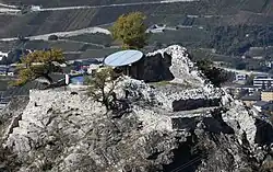 Beauregard Castle is located in the municipality of Chippis in the canton of Valais, Switzerland. It is located at the entrance to the Val d'Anniviers, on the right bank of the Navizence, on a rocky spur about 500 metres (1,600 ft) above Chippis and at an elevation of 1,012 metres (3,320 ft).[2] It is accessible from the south, from the village of Niouc. A natural fault, however, isolates it from the path which, in the Middle Ages, was completed by a wooden footbridge.[3] Also known as "l'Imprenable" (in English "the Impregnable"), the castle's location overlooks a panorama of the Rhône valley and part of the Val d'Anniviers.[2][4]