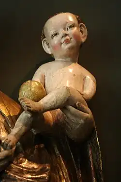 This sculpture was made at the beginning of the 15th century by an unknown artist. The sculpture is 119 centimetres (3 ft 11 in) high and can be viewed from three sides; the rear side is deeply hollowed to avoid cracking of the drying timber. This piece shows the Virgin Mary with a nude Baby Jesus holding an apple. The Virgin stands with an S-curve, and her clothes are richly pleated.