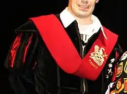 The beca is worn on the breast and shoulder, over the doublet. The colors of the beca and the coat of arms embroidered on it identify the university and school or faculty that the tuno belongs to. The beca is given to the tuno by his companions when they consider that he has enough experience, and is fit to represent his University Tuna and, by extension, his/her university.[1][2]