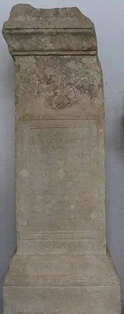 The Beccut cippus dates from the years 250–260.[9] It evokes the memory of a young woman, Beccut, who died in her early twenties and was cremated according to local tradition.[10] The Makthar archaeological site has revealed fifteen funerary poems dated between the 3rd and 6th centuries, but the earliest ones date no further than the end of the Severan dynasty and make up a group of nine artefacts to which the Beccut cippus belongs.[11]