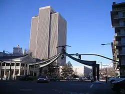 Beehive House (left), Eagle Gate, and LDS Church Office Building