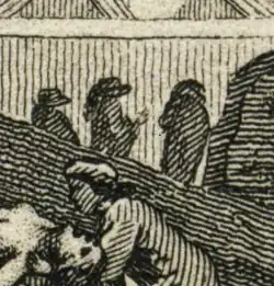The inhabitants of both Beer Street and Gin Lane are drinking rather than working, but in Beer Street the workers are resting after their labours – all those depicted are in their place of work, or have their wares or the tools of their trade about them – while in Gin Lane the people drink instead of working.[18] Exceptions to this rule come, most obviously, in the form of those who profit from the vice in Gin Lane, but in Beer Street Hogarth takes the opportunity to make another satirical statement. Aside from the enigmatic sign-painter, the only others engaged in work in the scene are the tailors in an attic. The wages of journeyman tailors were the subject of an ongoing dispute, which was finally settled by arbitration at the 1751 July Quarter Sessions (in the journeymen's favour). Some believe that the tailors serve another purpose, in that Hogarth shows them continuing to toil while all the other inhabitants of the street, including their master, pause to refresh themselves.[18] Much as the tailors are ignored by their master and left to continue working, the occupants of Beer Street are oblivious to the suffering on Gin Lane.