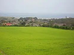 Beeston Hill, also known as Beeston Bump,[16] is a cliff-top hill which overlooks the sea and the village. At 207 feet (63m) high, it is the dominating feature of the parish. The hill, part of Cromer Ridge,[17] was once two symmetrical round flat-topped hills in the shape of giant molehills: geological features known as kames.[17] The two hills were left behind when glaciers retreated northwards at the end of the last Ice age, between 15,000 and 10,000 years ago,[17] a recent event in geological timescales. At that time most of what is now the North Sea was dry land, with the Rhine and the Thames combining to form a giant river estuary.[17] As the ice melted, the sea level rose and the North Sea was formed. Since then, the sea has eroded Beeston Bump: most of its seaward side had been washed away by the 1930s. Almost 90 yards (80m) of the cliff have now been lost to the sea, along with a brickworks which stood to the east of the summit and a football pitch. In recent times, coastal erosion has been slowed by building groynes and sea walls along the coast and below the hill.