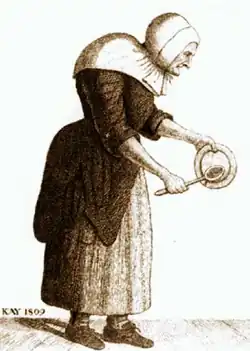 Instead of using a bell, Dick would beat a wooden plate with a spoon making a loud din to draw attention to announcements, working for just a penny per announcement.[2] She was known for wearing a distinctive long gown, cap and cloak.[3] Dick never married and died in 1773, her remains were interred at the east side of the old Churchyard, Dalkeith.[4]