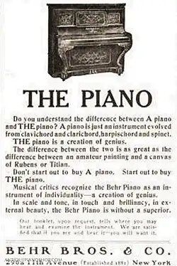 Behr Brothers was a New York based piano company founded in 1880 and hailed as a major contributor to the piano industry of the late nineteenth and early twentieth centuries. Henry Behr of Hamburg, Germany initially established a piano company in New York alongside Leopold Peck (of "Hardman Peck Piano Company") in 1877, named "Behr & Peck", which operated until 1879. In 1880, Behr and his brother Edward Behr went into partnership to form "H. Behr and Brother Piano Company", although this later changed to "Behr, Brother and Company", followed by "Behr Brothers & Company". The company was taken over by Kohler & Campbell in 1910, who continued to produce pianos under the Behr name until the 1950s.[1][2][3]