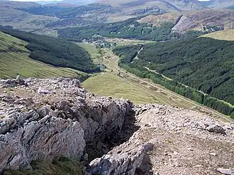 The hills other major corrie stands on the northern slopes, this is Coire Luaidh (Corrie of Lead) which contains the hills only crags on its higher slopes. The corries name refers to lead mining which took place in the 18th and 19th centuries. Beinn Odhar stands on the Tyndrum fault, whose veins yielded large amounts of lead on Beinn Chùirn to the SW, however the mines on Odhar were not as productive. The best example of former mining activity on the hill can be seen on the southern slopes, at a height of 650 metres there is considerable evidence of an adit going into the hillside and much mining waste.[4] Beinn Odhar stands on the drainage divide of Scotland with rainfall from the mountain going to both coasts, either going west via Glen Orchy to reach the sea at Oban or east by the River Tay to reach the sea at Dundee.
