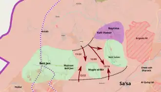 On 22 December, the Army captured a farm area south of Mazaraat Beit Jinn.[31][32] Two days later, pro-government forces started the third phase of their offensive.[33] SAA, Hezbollah and Iranian-backed Shia and Druze militias encircled Maghar Al-Mir and advanced towards Beit Jinn, assisted by heavy aerial strikes.[34]