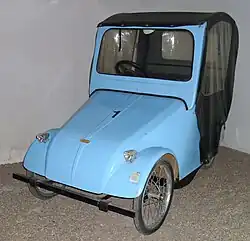The manufacturer's first car was the Super Véloto, described as a "quadricycle" with an auxiliary motor.[3] The motor was a rear-mounted twin cylinder air-cooled 50cc engine[3] from Motobécane which powered the rear wheel via a V-belt and chain linkage.[3] Front suspension was a minimal affair involving rubber rings: suspension at the back was non-existent.[3] Comfort was not a priority and nor was noise suppression in respect of the engine. There were no brakes at the front, but the rear wheels had drum brakes fitted: these were controlled using a hand-lever.[3] The thick leather-look steering wheel was generously padded and provided a contrast with the minimalist approach applied to the rest of the design.[3]