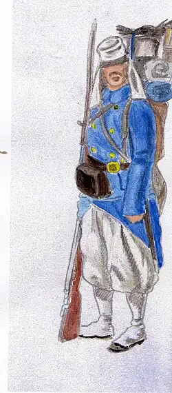 Officially "The Belgian Expeditionary Corps" this Legion comprised an infantry regiment of two battalions - the "Empress Battalion" of grenadiers and the "King of the Belgians' Battalion" of voltigeurs. The officers and non-commissioned officers were mainly drawn from the regular Belgian Army as were some of the other ranks.[3] The Belgians formed part of a much larger "Imperial Mexican Corps of Austrian and Belgian Volunteers", though they served separately from the Austrian contingent which was brigaded with Mexican Imperial troops.[4]