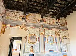 The west wing of the castle, in neoclassical style and dominated by a large balcony, was rebuilt by Prince Antonio Barbiano di Belgioioso, who entrusted the work to Francesco Croce. On this side of the castle are the noble rooms of the manor, connected by a grand stone staircase, on the walls of which hang tapestries, flags, and weapons bearing the coat of arms of the princes. Also on the second floor is the large ballroom (measuring 13 x 13 meters), which is entirely frescoed according to a decorative program designed by Leopoldo Pollack,[3], and the gallery of the ancestors, enriched by white marble fireplaces and Baroque stuccoes made between 1740 and 1760 by Carlo Beretta in which are depicted the busts of 19 members of the lineage and the exploits they conducted described with inscriptions in pure gold.[13]
