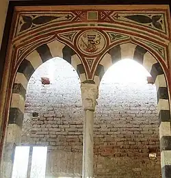 In the eastern part of the castle, which has most maintained the appearance of the medieval fortress, a stone staircase dating back to the 18th century is preserved, while restorations undertaken after 2008 have returned a 14th-century mullioned window entirely painted with a blue-and-white lozenge motif and the coat of arms of Galeazzo II Visconti, and traces of the same decoration have also emerged in some rooms leaning against the castle's eastern façade. Other rooms in this wing of the castle, on the other hand, are decorated with telamons and heraldic devices of the Barbiano di Belgioioso family dating from the late 16th century. Also in the eastern part of the castle, during restorations in 2014, the remains of a two-story tower, also dating from the 14th century, were identified and later incorporated inside the building.[4]