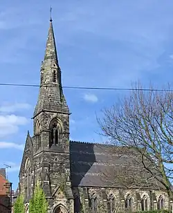 It was built to replace an earlier chapel of 1790 which the congregation had outgrown. It was designed by George Woodhouse of Bolton, Architect[2] and built by Mr. Cash of Duffield. It comprised a nave with entrance vestibule and staircase, and a chancel at the east end which contained the organ and choir. On either side of the chancel, vestries were provided. There was a gallery at the west end and provision was made for galleries on each side if later required. The tower at the south-western angle of the building was surmounted by a spire and metal finial. The walls were of stone and both ashlar and dressings were from local quarries. There were sittings for 550 persons. The total cost was about £4,000 (equivalent to £451,100 in 2023).[3] The church opened on 13 November 1872.[4] The church was extended to form a schoolroom in 1899. In the 1980s, the church building became surplus to requirements. The congregation moved into a new smaller building behind and in the late 20th century the 1872 building was converted to housing.