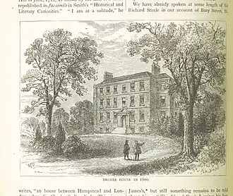 After 1720, Belsize became a place of public entertainment to cater to the growing traffic heading towards the fashionable Hampstead Wells.[3] This included serving refreshments as well as turning the grounds into pleasure gardens. It soon gained a reputation for hosting gambling as well.
