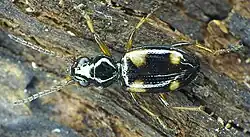 Bembidion is the largest genus of beetles in the family Carabidae by number of species.[2] All species are small (less than 7.5 mm) and move very fast. Most of them live close to water.[2] The genus has a biantitropical distribution, meaning they are found in both the Northern and Southern Hemispheres, but not in the tropics.[3] In warmer regions it is substituted by closely related Tachys and other genera.[2]