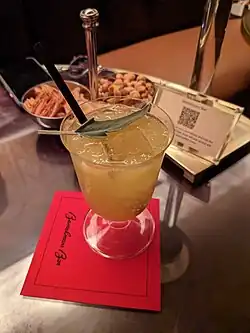 Recent drinks have included The Gillespie, named for Chris Gillespie (a long-time entertainer at the bar) and made with Hudson Manhattan Rye, lime juice, rosemary ginger syrup, ginger beer, and egg white. The JFK Daiquiri, another served at Bemelmans, was inspired by the daiquiri, one of John F. Kennedy's favorite drinks.[9] Drinks and food are expensive: cocktails averaged $23-25 in 2016.[1][2]