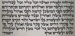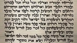 Bemidbar, BeMidbar, B'midbar, Bamidbar, or Bamidbor (בְּמִדְבַּר‎—Hebrew for "in the wilderness of" [Sinai], the fifth overall and first distinctive word in the parashah), is the 34th weekly Torah portion (פָּרָשָׁה‎, parashah) in the annual Jewish cycle of Torah reading and the first in the Book of Numbers. The parashah tells of the census and the priests' duties. It constitutes Numbers 1:1–4:20. The parashah is made up of 7,393 Hebrew letters, 1,823 Hebrew words, 159 verses, and 263 lines in a Torah Scroll (סֵפֶר תּוֹרָה‎, Sefer Torah).[1] Jews generally read it in May or early June.[2]