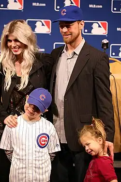 Zobrist lives in Franklin, Tennessee.[50] He and his former wife, singer Julianna Zobrist (née Gilmore), have three children, one of whom was born five days after Zobrist's Royals won the 2015 World Series.[51] Julianna gave birth to Blaise Royal the day after the Royals World Series parade.[52][53] In May 2019, Zobrist filed for legal separation in Tennessee on the same day that Julianna Zobrist filed for divorce in Illinois.[40] Their marital problems had led Zobrist to pause his participation in the 2019 MLB season.[54]