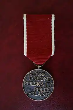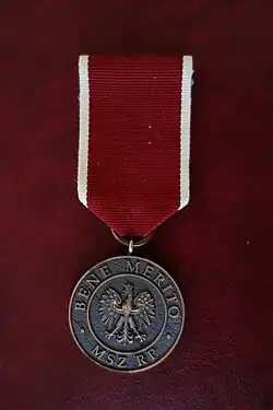 The Bene Merito honorary distinction (Polish: Odznaka Honorowa „Bene Merito”; Latin for "well-merited" or "worthy") is a departmental (ministerial) decoration of Poland. The Minister of Foreign Affairs of Poland awards the citizens of Poland and foreign nationals with this decoration "in recognition of their merits in promoting Poland abroad."[1][2][3]