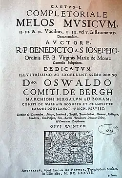 Furthermore, Buns composed 13 trio sonatas for 2 Violins, Viola da Gamba and Basso Continuo (Bass viola and organ) which were published in 1698 in his opus VIII with the title: Orpheus Elianus è Carmelo in Orbem Editus a 2 Viol. et Basso viola cum Basso Continuo. These compositions were dedicated to Count Oswald van den Bergh Boxmeer and his wife Maria Leopoldina van Oost-Friesland-Rittburg.[17] Opus V and Opus VII by Buns were also dedicated to Count Oswald van Bergh.
