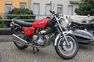 The Benelli 750 Sei was the first production motorcycle with a 6-cylinder engine and had two model releases.[3][4] De Tomaso intended it to become Italy's premier sporting motorcycle and wanted it badged as a Moto Guzzi. On its launch, it received tremendous publicity overshadowing all other Italian bikes of that year. It started the trend of angular designed motorcycles moving away from traditional round forms.[5]