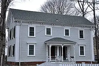 The Benjamin Hibbard Residence is a historic house at 5-7 Gerry Street in Stoneham, Massachusetts, United States. It is one of a few well-preserved 19th-century double houses in Stoneham. The two-story wood-frame house was built c. 1850, and features double brackets along its cornice, pilastered corners, and a decorated porch covering the twin entrances in the center of the main facade. The house is typical of modest worker residences built at that time. Its only well-documented occupant, Benjamin Hibbard, was a carriage driver in the 1870s and 1880s.[2]