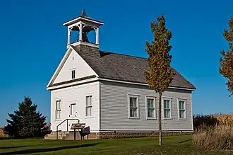 The 1911 school replaced an earlier school that had existed on the site since the 1880s. By the early 20th century local farmers were prospering, and chose to build a high-quality replacement school. The school features a large belfry with a 30-gallon cast iron bell on a higher-than-usual roof. The one-story wood-frame school measures about 34.5 feet (10.5 m) deep and 22.5 feet (6.9 m) wide on a shaped stone foundation. The sole door is centered on the gabled front facade with the belfry above, flanked by two two-over-two sash windows. A cloakroom vestibule spans the front of the school on the west side, opening into the classroom. There are no windows on the north side, a concession to winter winds. Two windows on the east side and four on the south side light the room, which features a pressed tin ceiling. Walls were plastered and had beaded wood wainscoting. The plaster has been replaced by drywall and the wainscot has been preserved. The wood strip floor has been preserved.[2]