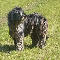 It is characterised by a long thick coat which covers every part of the dog. Particularly on the hind part of the body, the coat forms long matted locks which provide good protection from bad weather; on the fore part of the body the hair is coarse and forms wavy ringlets like those of a goat, while the hair on the head is rather finer.[7] The coat may be of any shade of grey, from very pale to matt black; some tinges of isabella or fulvous colour are allowable.[7]