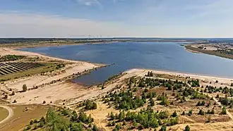 The flooding of the pit, under the direction of the LMBV company in charge of dealing with the consequences of lignite mining, began in September 2001 and ended in May 2014.[1][2] The lake is part of the Lusatian Lake District, but is isolated from the Lusatian Lake Chain as it is 20 km (12 mi) away from the waterways linking the other lakes. The Bergheider See has a surface area of about 320 ha (3.2 km2; 1.2 sq mi). On the Lichterfeld shore (north shore) are bathing facilities.[3] The other shores have been designated as Nature Preserves. There are also restricted areas belonging to the LMBV (Lausitzer Mitteldeutsche Bergbau Verwaltungsgesellschaft = Lusatian Central German Mining Administration Company).