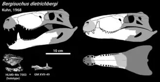 2. ^ a b c d e f g h i j Rossmann, T.; Rauhe, M.; Ortega, F. (2000). "Studies on Cenozoic crocodiles: 8. Bergisuchus dietrichbergi Kuhn (Sebecosuchia: Bergisuchidae n. fam.) from the Middle Eocene of Germany, some new systematic and biological conclusions". Paläontologische Zeitschrift. 74 (3): 379–392. Bibcode:2000PalZ...74..379R. doi:10.1007/BF02988108. S2CID 129507618.