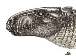 The lower jaws are mostly only known from incomplete dentaries (as well as part of the splenial), and their surfaces are as similarly strongly sculpted as the upper jaws. The teeth are relatively narrow and serrated (ziphodont), similar to those of predatory theropod dinosaurs and unlike the conical teeth of modern crocodylians. Few teeth themselves are preserved, but they include a very large and prominent serrated 'pseudocanine' that fits into the notch of the upper jaw. This canine is approximately 2 cm tall, and sits on a prominently raised portion of the jaw bone, which arches down in front and behind it and so the rest of the jaw is quite shallow.[6] The rest of the teeth are mostly missing, but the size and shape of the remaining alveoli indicate the size and position of the other teeth in the jaws. The other teeth are around 3 times smaller in diameter than the canines, a unique characteristic of this genus, and are closely packed behind the canine in the lower jaw. Three small teeth are present in front of the canine, the first of which is larger and procumbent, facing up and forwards at the front of the jaw. The maxillary teeth are similarly small, the largest being the third tooth, and the rest of which getting progressively smaller behind it. Premaxillary teeth are unknown, but it possibly had another pair of larger 'pseudocanines' in the upper jaw. It is estimated that there were only 13 teeth in each lower jaw, and at least 13—14 in the upper jaw, a relatively small number compared to other sebecosuchians like Iberosuchus. The teeth are not as strongly compressed as other ziphodont crocodilians, and so may have been stronger and more resistant to stress.[2]