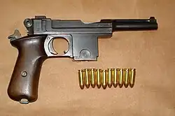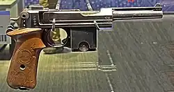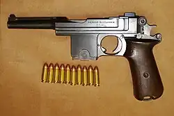 The Bergmann–Bayard Model 1903 was adopted by the Spanish Army in 1905 as the Pistola Bergmann de 9 mm. modelo 1903. Unable to find a German manufacturer to complete the Spanish order for 3,000 pistols, Theodor Bergmann turned to a Belgian manufacturer, Anciens Etablissements Pieper (who used the trademark "Bayard") who completed the order.[1] The modified pistol was known as the Bergmann Bayard 1908 (not to be confused with Pieper-Bayard 1908), or in Spain as the Pistola Bergmann de 9 mm. modelo 1908. Although adopted in 1908 delivery of the approximately 3,000 weapons was not completed until two years later. Meanwhile, other manufacturers such as Campo-Giro had adopted the 9mm Bergmann–Bayard round and, due to its long history of use in Spanish submachine guns, carbines and pistols, today it is most commonly known as the 9mm Largo.