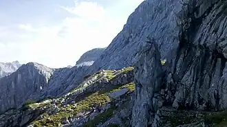![]() Northern wall of the Alpspitze with via ferrata Nordwandsteig (right), leading to the Bernadeinkopf (left) | |