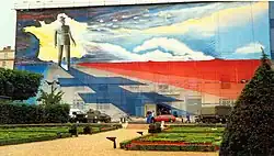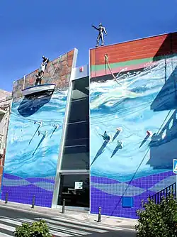 In 1989, he dressed in colors the theater of Karlsruhe, enormous building in concrete, for the "European Meetings of the Culture" in Germany. Romain has since turned several whole buildings into works of art, transforming many edifices into colourful, Trompe-l'œil, masterpieces. Often the buildings are local authority premises, such as the Saint Mandé council offices, Paris, for which Romain won the prize for the world's largest mural in 1990. The mural covered an area of 1200 m2 and was commissioned to celebrate the year of Charles de Gaulle. Near Tancarville, in Normandy, he composes "the breath of the earth" in Saint-Romain-de-Colbosc. It is the dressing of a public building, by using industrial materials like ready-made.