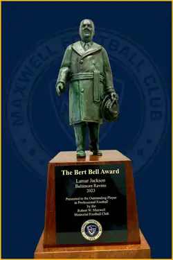 The Bert Bell Award is presented by the Maxwell Football Club to the player of the year in the National Football League (NFL). The award is named in honor of Bert Bell (1895–1959), commissioner of the NFL and founder of the Maxwell Club. Voters for the Pro Awards are NFL owners, football personnel, head and assistant coaches as well as members of the Maxwell Football Club, national media, and local media.[1] The award consists of a trophy in the form of a statue in the likeness of Bell. The award is presented at the club's annual football banquet.