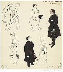 Berthe began a relationship with the politician Aristide Briand in 1907.[1] When Briand fell for her she was a blonde beauty, charming and elegant in the long dresses and high hats of the period. She had natural assurance and was financially secure due to her "bon ami" Johnston.[11] By 1910 the former socialist's politics had moved to the right due to her influence. He had taken a liking to visiting salons, where he met writers, artists and women of high society.[12] In 1913 Briand met Princess Marie Bonaparte, wife of Prince George of Greece. For a long time she refused Briand's advances, since she did not want to share him with Berthe. The rupture finally came in April 1916, when Berthe wrote to Briand telling him not to visit her again, and to let her gently forget him.[13]