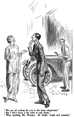Later, Bertie finds Jeeves smoking by the car. Bertie, who has lost his cigarette case, asks to smoke one of Jeeves's. While they smoke, Jeeves tells Bertie that in his youth, he was a page-boy in a school for young ladies, and that the girls often stared and giggled at guests to make them uncomfortable. This makes Bertie nervous. Later, Peggy returns Bertie's cigarette case to Jeeves, claiming that Bertie must have dropped it. She is excited to hear Bertie speak because the girls like to sit and stare at guest speakers. She leaves, and Bertie appears, telling Jeeves to start the car, because he learned Miss Tomlinson expects him to speak to the girls. Jeeves tells him the car is out of order and will take a little time to repair.